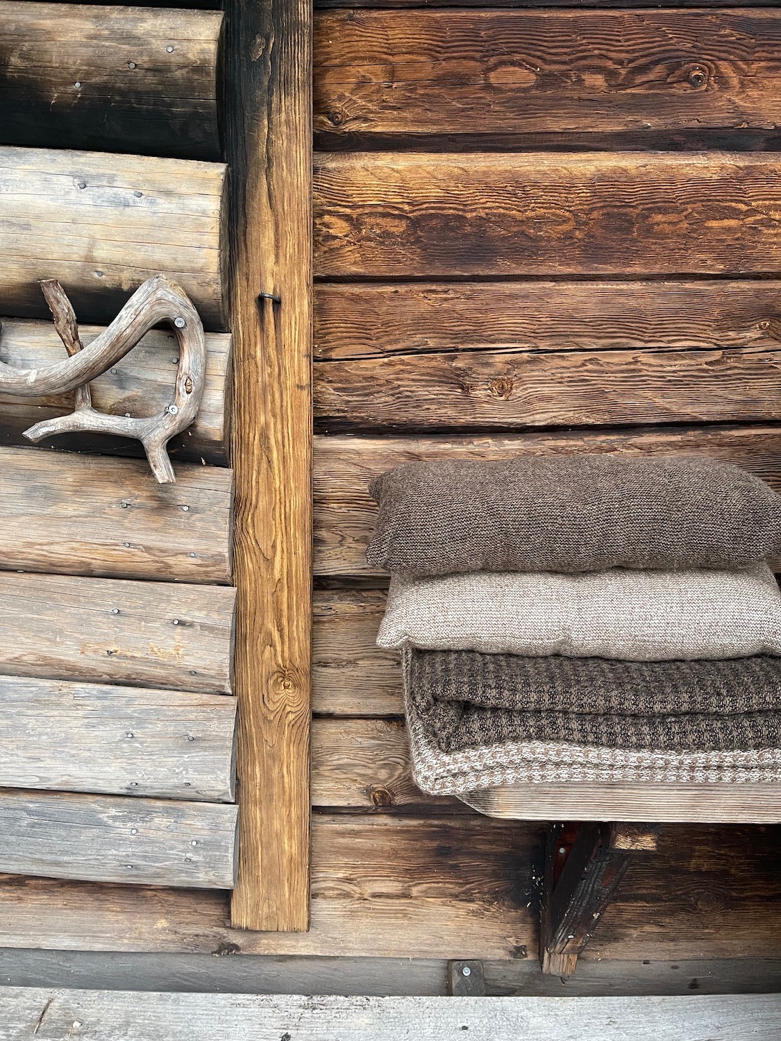 Käsityönä valmistetun niskatyynyn päälikangas on 100 % villaa.